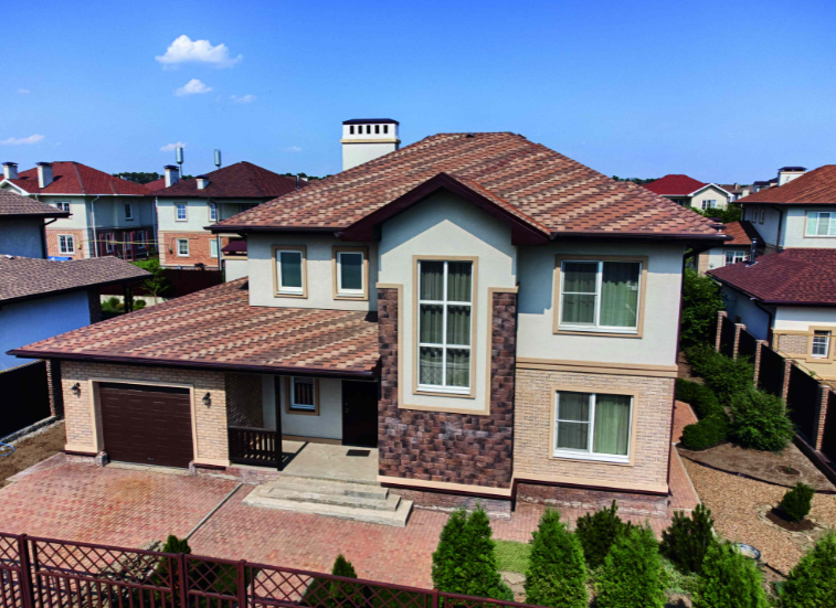 Применяется в качестве основного кровельного покрытия при угле наклона ската от 12° до отрицательных углов. Рисунок готовой кровли хаотичный.