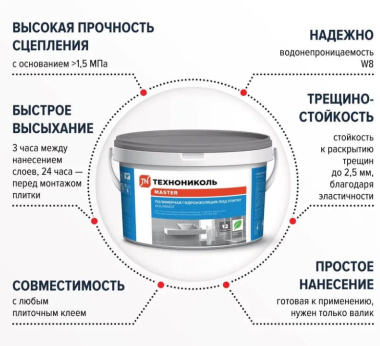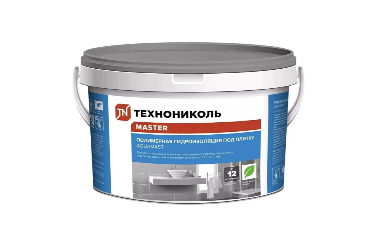 Гидроизоляция полимерная AquaMast под плитку – готовая к применению пастообразная мастика на основе водной дисперсии полимеров для гидроизоляции пола и стен внутри помещений, в том числе под облицовку плиткой с устройством обогреваемых тёплых полов.